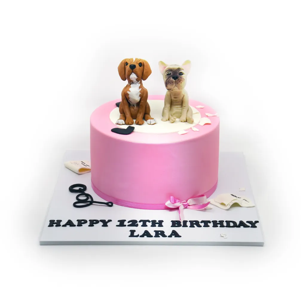 Celebrate canine charm with this dog themed birthday cake, designed with pink frosting and lifelike fondant dog toppers. Featuring a brown and white Beagle and a light tan French Bulldog, the cake captures pet personality with playful detail. Grooming-themed decorations including fondant scissors, comb, and accessories add a creative twist, while the pink ribbon base and clean lettering complete the look. Perfect for dog lovers and themed parties, this cake blends sweetness with style for a memorable celebration.